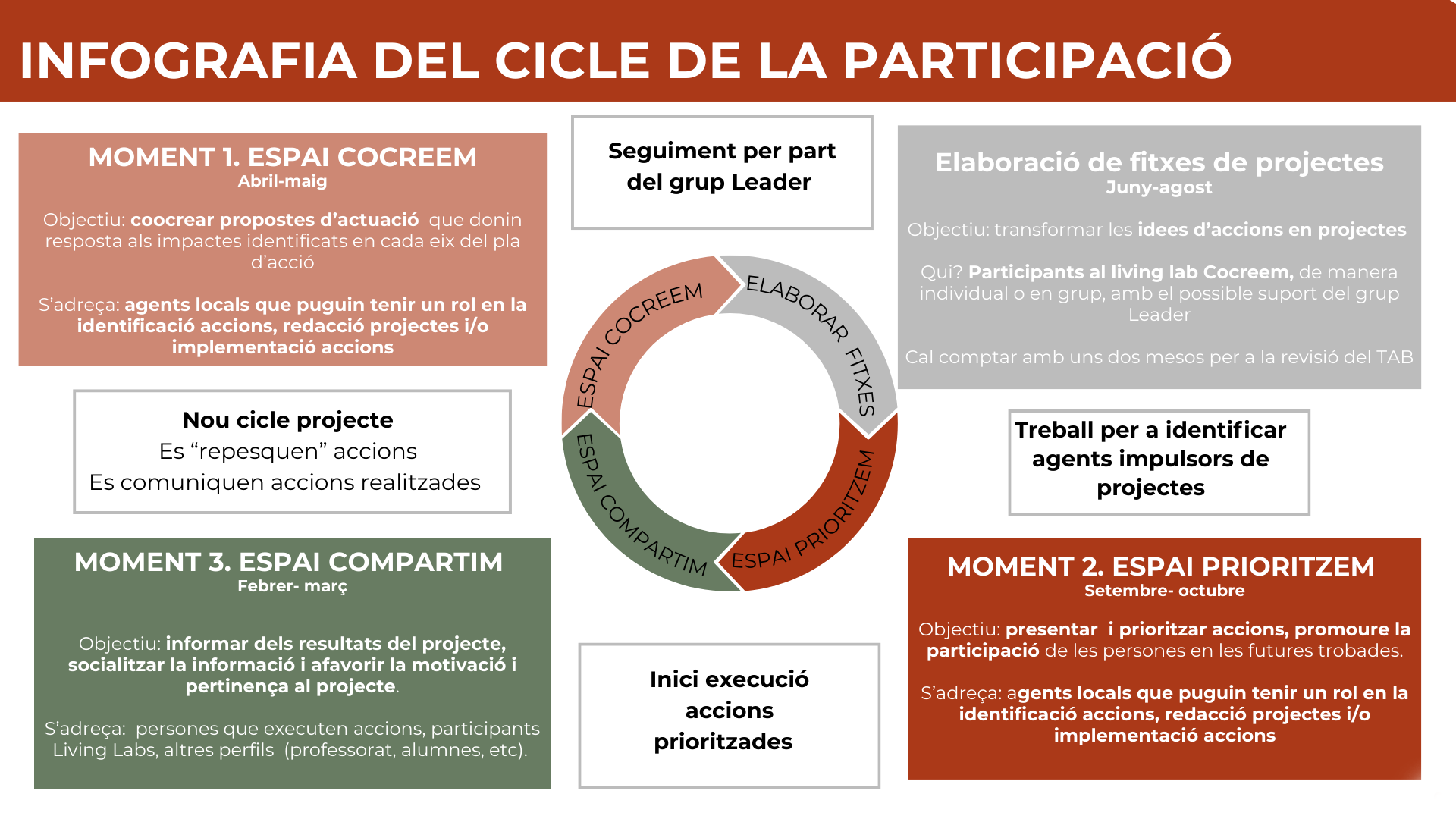 Es va presentar una proposta de com podria ser un cicle de concreció, per tal de potenciar tant els espais dedicats a aquesta cocreació (amb un marge temporal suficient per a concretar els projectes) com els dedicats a compartir els resultats de les accions en curs i a potenciar el compromís dels agents locals. Aquest cicle proposat té tres moments claus, dedicats a cocrear, prioritzar accions i compartir, i un d’elaboració de fitxes d’accions, com es resumeix a la imatge.