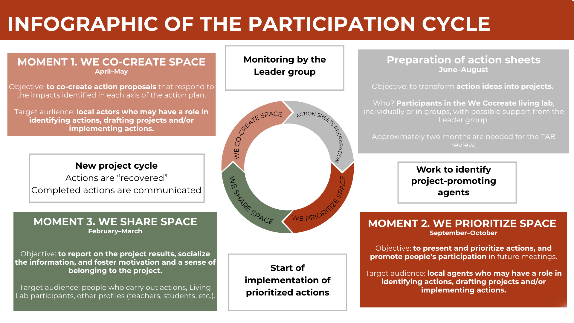 A proposal was presented for what a “concretion cycle” could look like, aimed at strengthening spaces dedicated to co-creation (with enough time to define projects) as well as those for sharing ongoing action results and boosting local stakeholder commitment. This proposed cycle includes three key stages—co-creating, prioritizing actions, and sharing—plus a step for drafting action sheets, as summarized in the image.