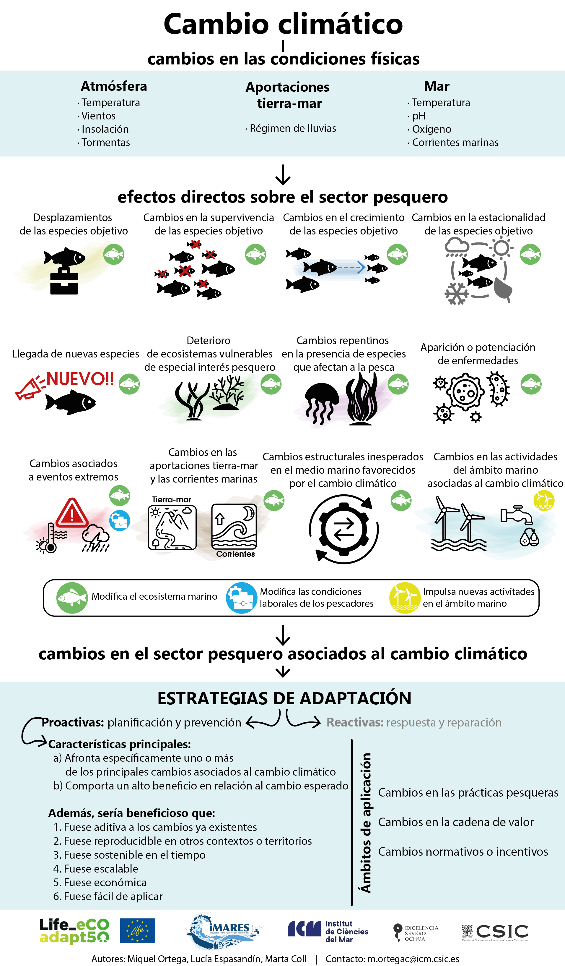 - Efectos del cambio climático en el sector pesquero catalán (PDF en catalán). Este documento describe de manera simple los efectos directos e indirectos del cambio climático sobre el sector pesquero catalán -entendiendo éste como la pesca y la acuicultura marítima-. Para ello, analiza 12 efectos que sabemos que pueden ser relevantes para el sector pesquero. Descárgate aquí la infografía (en castellano).